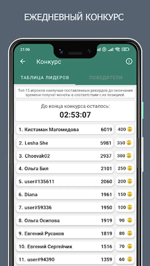 ✓ Daily tournament. Be in the "Top 15" on the Leaderboard and get coins as a gift.