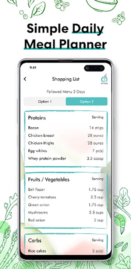 -SHOPPING LIST: Displays your semi-personalized food portions for the entire week to keep you free of worries and preventing you from going back to the store.