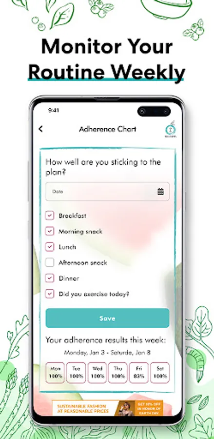 -ADHERENCE CHART: This tool will evaluate your efforts and commitment. Complete this chart on a daily basis to ensure your adherence to the plan. The app will provide a score at the bottom of the screen which enables you to get an idea of how consistent you are with your routine.