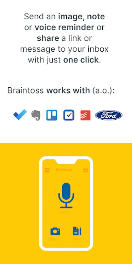 Braintoss works with: Evernote, Trello, Todoist, Dropbox, Things, Microsoft To Do and other apps that allow input via email.