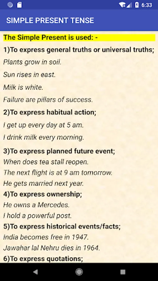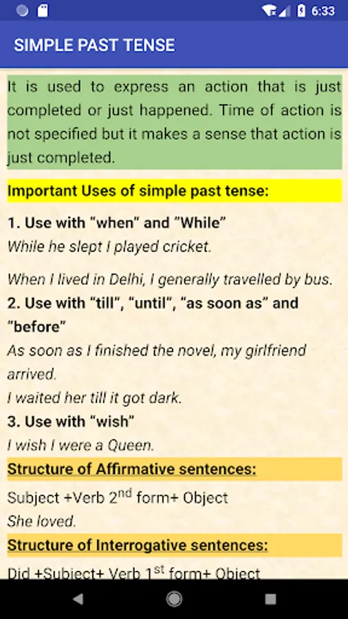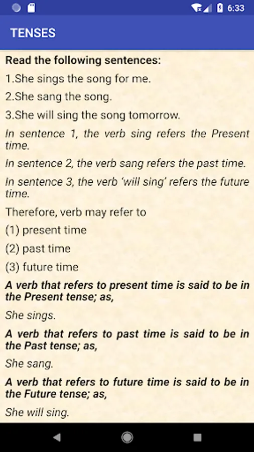 English Tenses are important part of English Grammar.Basic knowledge of English tenses is essential for native as well as non-native English speakers to improve English speaking & writing skills.This application helps users to learn & improve the English tenses in a very easy and effective manner. Basics of English tenses with practice exercises are covered in most simple way.Following items are covered in the application: