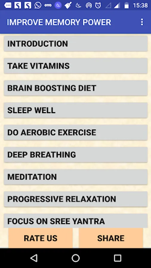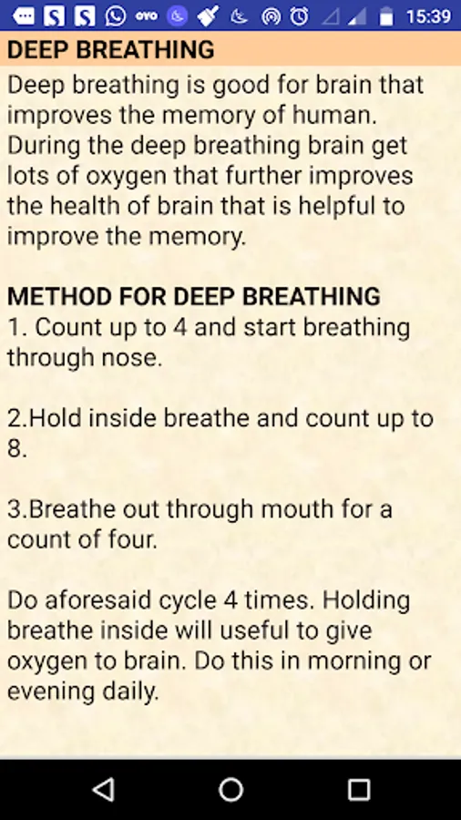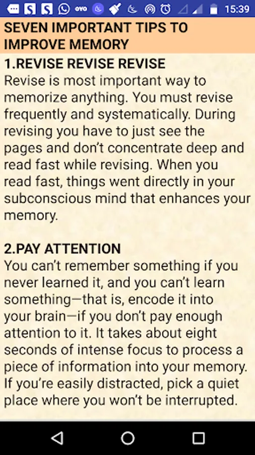 Tips to improve memory have been discussed in this android application.Learn with concentration is best method to improve memory.Improvement in capability of mind also helps to improve memory. This application discussed the topics related to meditation,brain boosting diet,high concentration,progressive relaxation etc. that are helpful to improve memory.