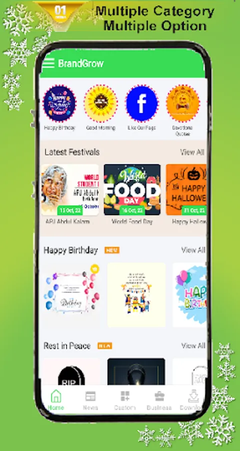 Brand Grow is a festival banner and business banner maker app which helps you to promote your business by sharing festival banners, ads banners, greetings banners and wishes banners with your brand name, Contact Number, Bisiness Website, brand details and brand logo.