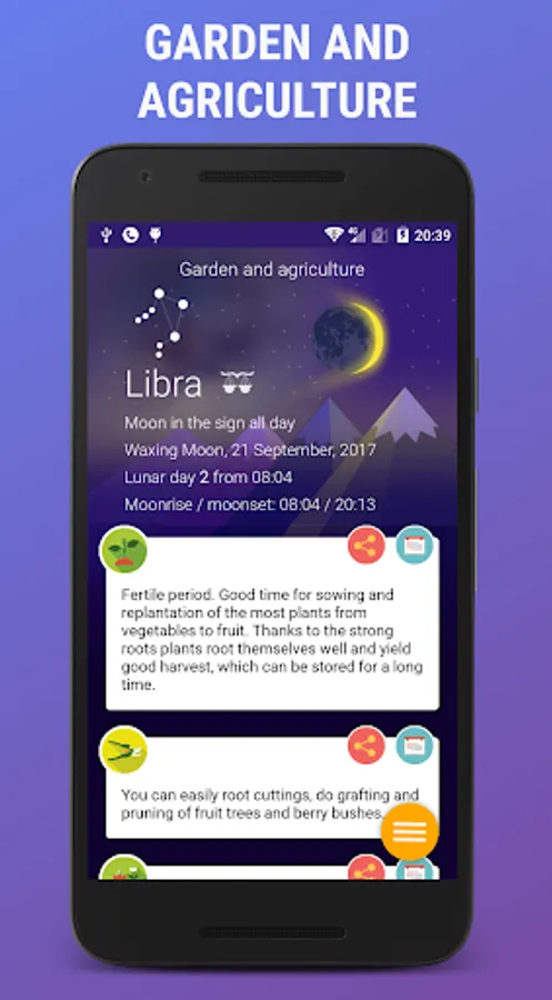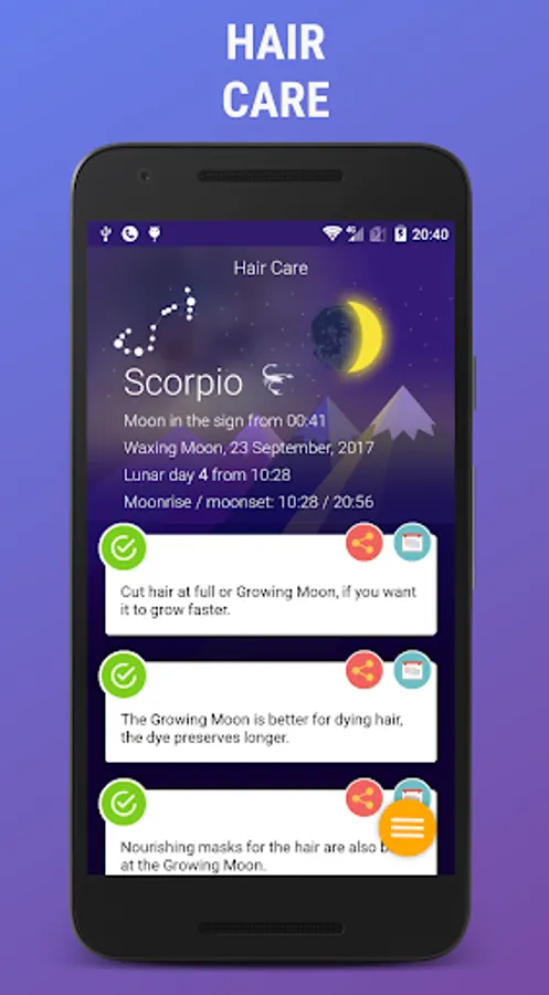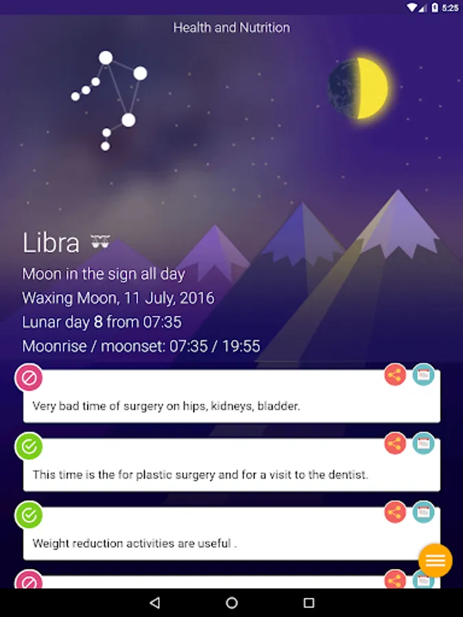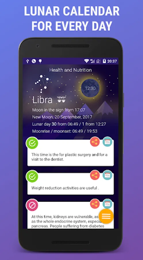 For the first time ever we’ve developed the most accurate algorithm of lunar days calculation available in the internet, so you don’t have to worry about the correctness of recommendations and you won’t miss the beginning of a lunar day.
