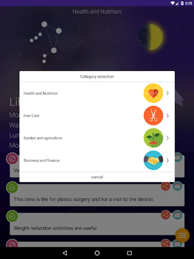 For your convenience we’ve integrated the feature of calculation of the nearest days with the detailed description. All recommendations are based upon multiple parameters, such as the moon in a certain zodiacal sign, the moon phase, the lunar day, etc.