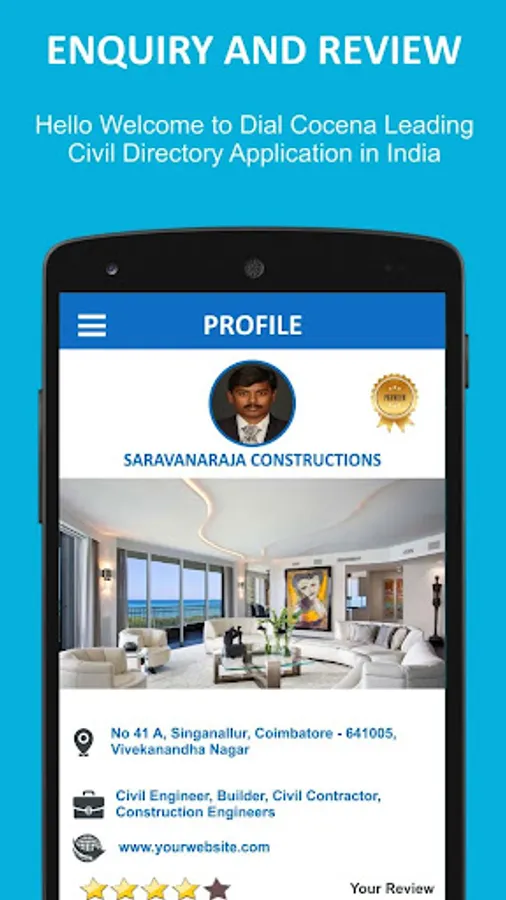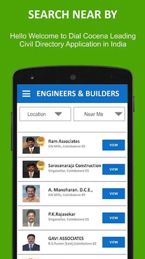 The Dial Cocena Android app is here to take your Construction Industry search experience mobile, Anytime, Anywhere. Dial Cocena mobile app makes it extremely easy to search Builders, Engineers, Consultants, Architectural designers, Interior Decorators, Contractors, Building material suppliers, manufacturers, Dealers etc in and around Coimbatore. The app has detailed listings and also enables users to get the contact details of the listings by SMS & E-mail. So, now stay a Step Ahead with Dial Cocena Android App & search construction industry related materials even on the Go!