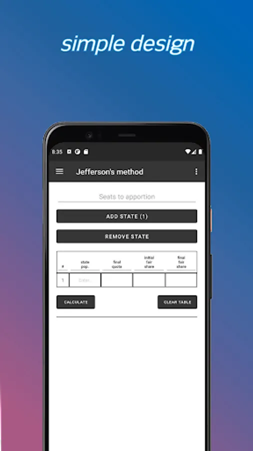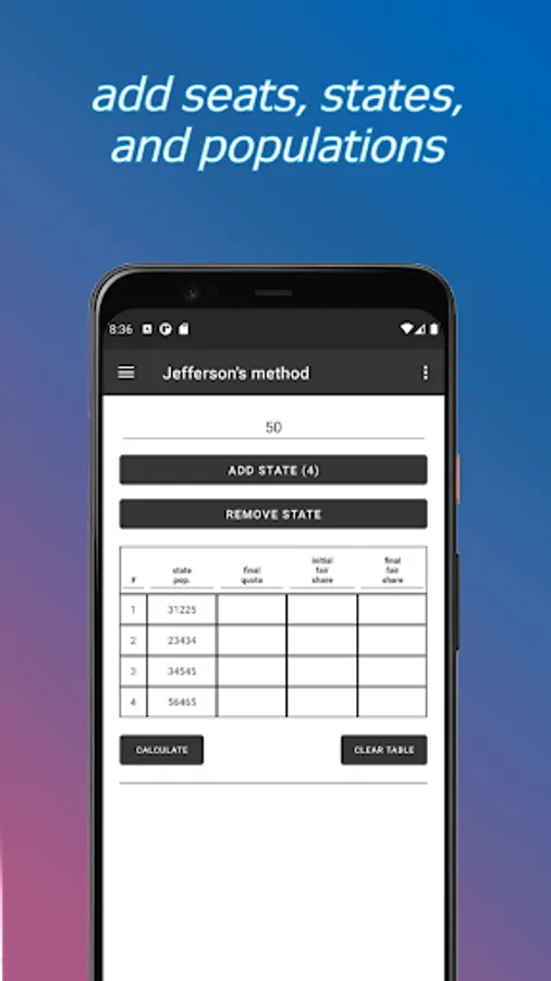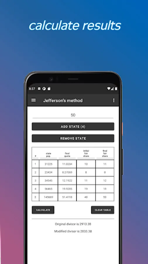Calculate quotas, fair-shares, and divisors for Jefferson's, Adam's, Webster's, Hamilton's, and Huntington Hill's apportionment methods.