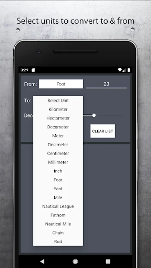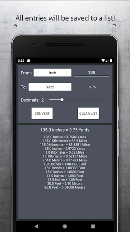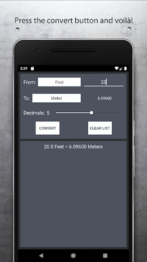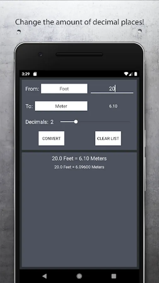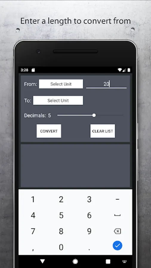 This app converts a specified amount of a unit of length to a different unit of length. For example, it can convert Metric units of length to Imperial units of length.