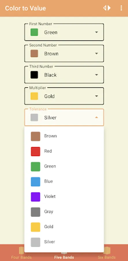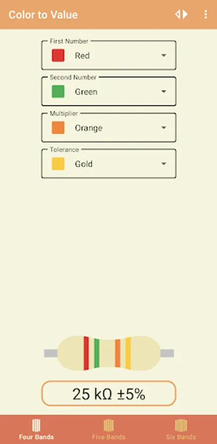 For "Color-to-Value" - Select the appropriate amount of bands and select each color in the drop downs, once all options are chosen the values will appear near the bottom of the screen. Note, if your phone screen is on the smaller side, then the dropdowns will become scrollable.