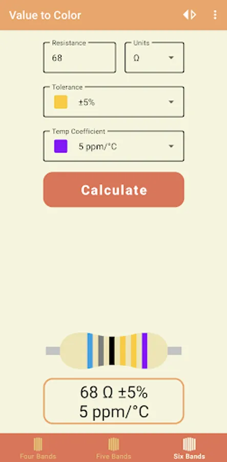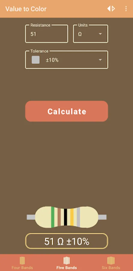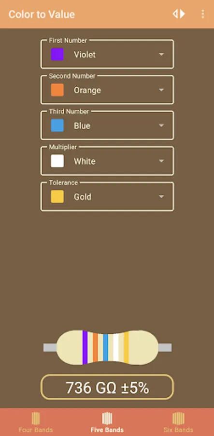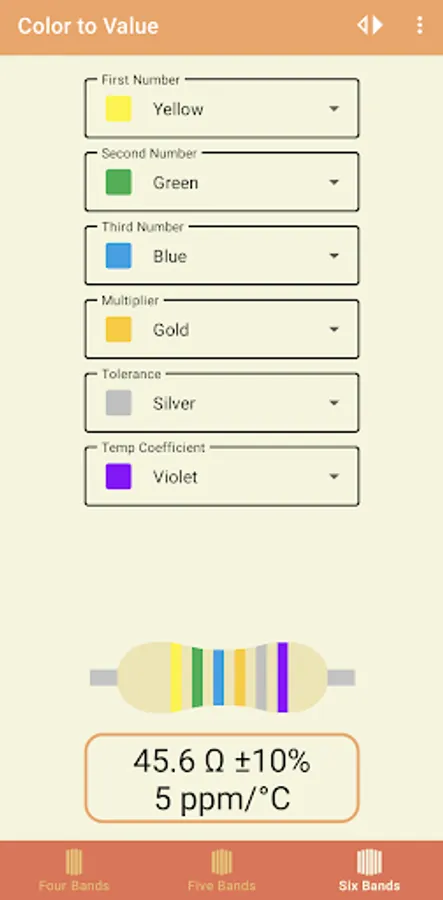 This app works for four, five, and six band resistors.