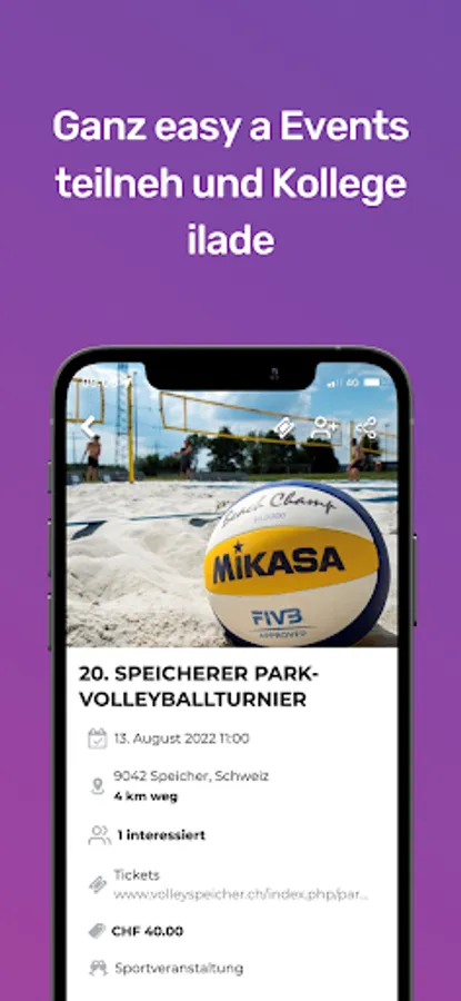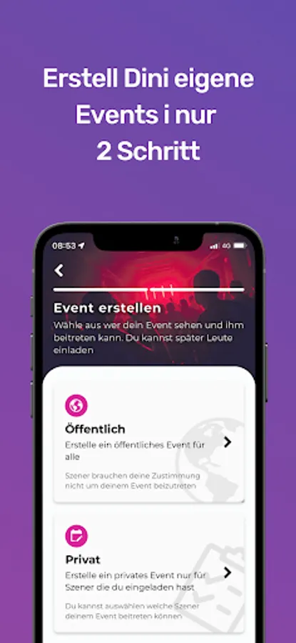 Or organize an event yourself. With one simple step you can organize the next barbecue evening with friends, a great home party or the next football game on the sports field. In the two modes, public and private, you can make your event accessible to everyone or exclusively to your friends.
