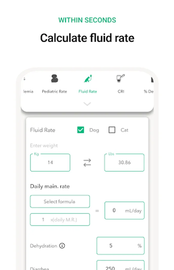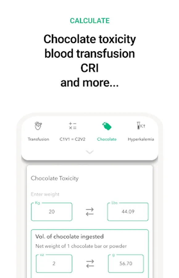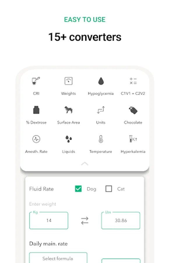 Our intuitive and user-friendly interface saves valuable time and eliminates errors in drug dosing calculations, ensuring that your patients receive the best possible care. Plus, Vet Easy offers 15+ converters, including fluid rate calculator, % Dextrose solution, CRI calculator (single and multi-drug), RER and MER, Blood transfusion, Pediatric rate, Shock rate, Anesthesia rate, Drip rate, Hypokalemia Rx, Hypoglycemia Rx, Weight conversions, Length conversions, Liquid conversions, Temperature conversions, and Body surface area calculator.