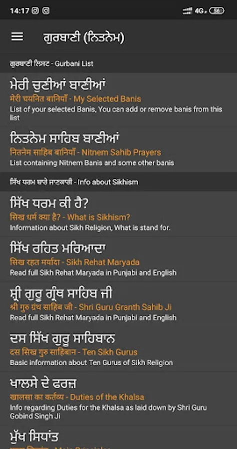 You can read from bani from Shri Guru Granth Sahib Ji, Shri Dasam Granth, These includes Nitnem, Japji Sahib, Jaap Sahib, Tav-Prasad Savaiye (Saraavaga Sudh), Chaupai Sahib, Anand Sahib, Rehraas Sahib, Kirtan Sohila, Sukhmani Sahib, Dukh Banjani Path, Shabad Hazare, Chandi Di Vaar, Zafaarnama, Aarti, Ardaas and over 100+ more Bani's.