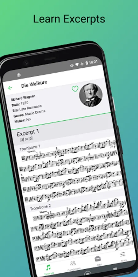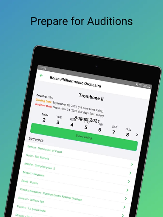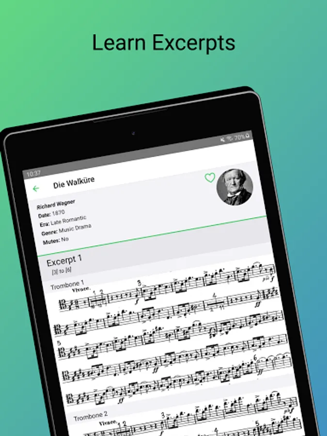 Contained in this app are excerpts commonly required for orchestral auditions. This app is equally geared towards all brass instruments with the option to view excerpts by individual instrument or multiple at a time. If you are actively searching for auditions, this app contains up-to-date information about orchestra opening all across the globe and will automatically provide you with the excerpts required for each audition. You can also get a jump start on auditions with every part of every piece directly at your fingertips. Randomize all excerpts or save your favorites; it is up to you with versatile practice tool!