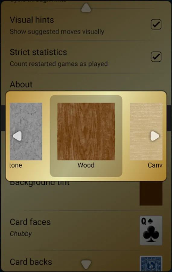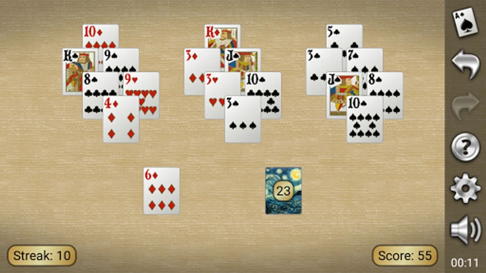 There are many options to change the way the app looks and works. Tap the Config button (looks like a small gear) and pick Settings to tailor the game to your preferences. Yukon Gold Solitaire now features new card faces and display settings specially designed for players with impaired vision.