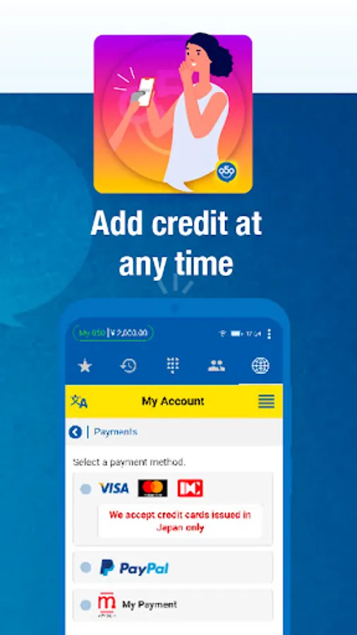 Add credits to your account (by credit card, PayPal, or at convenience stores in Japan with My Payment) and enjoy some of the lowest calling rates in the market!