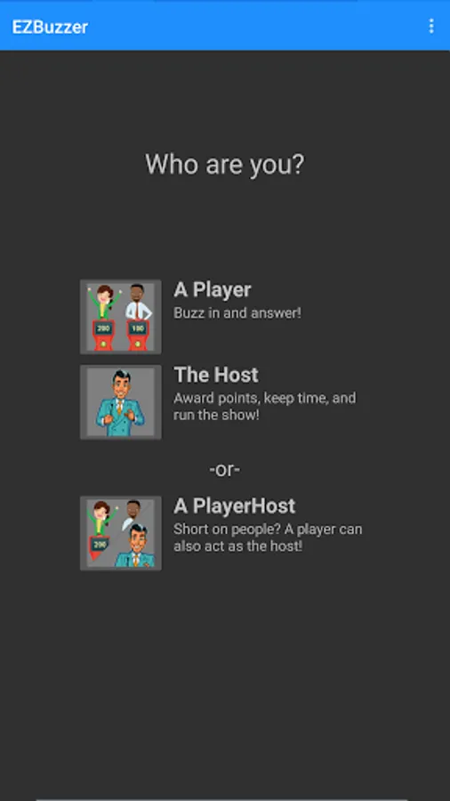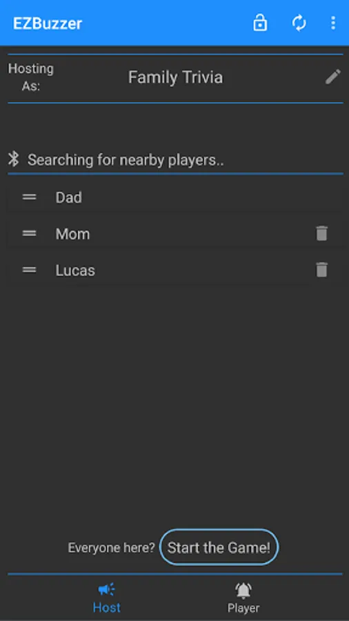 EZBuzzer works over Bluetooth - no hassle with joining a WiFi network or dropped WiFi signals. Initial start-up is simple: One person should sign on as a Host or PlayerHost, and then all others as Players. Players will automatically connect to the Host, and then the fun can begin! As this game is Bluetooth-based, players should be nearby...this is an app to play with your friends or family together! Don't like ads? You can remove them easily for a small one-time fee. Are you a teacher, or a generous friend? Go Premium and remove ads not just for yourself, but also for any Player while they are connected to your game as a Host.