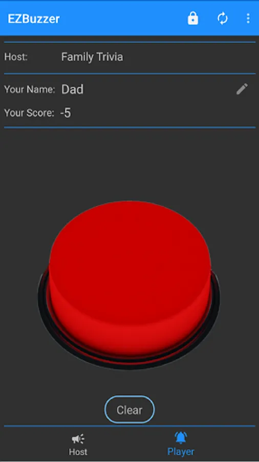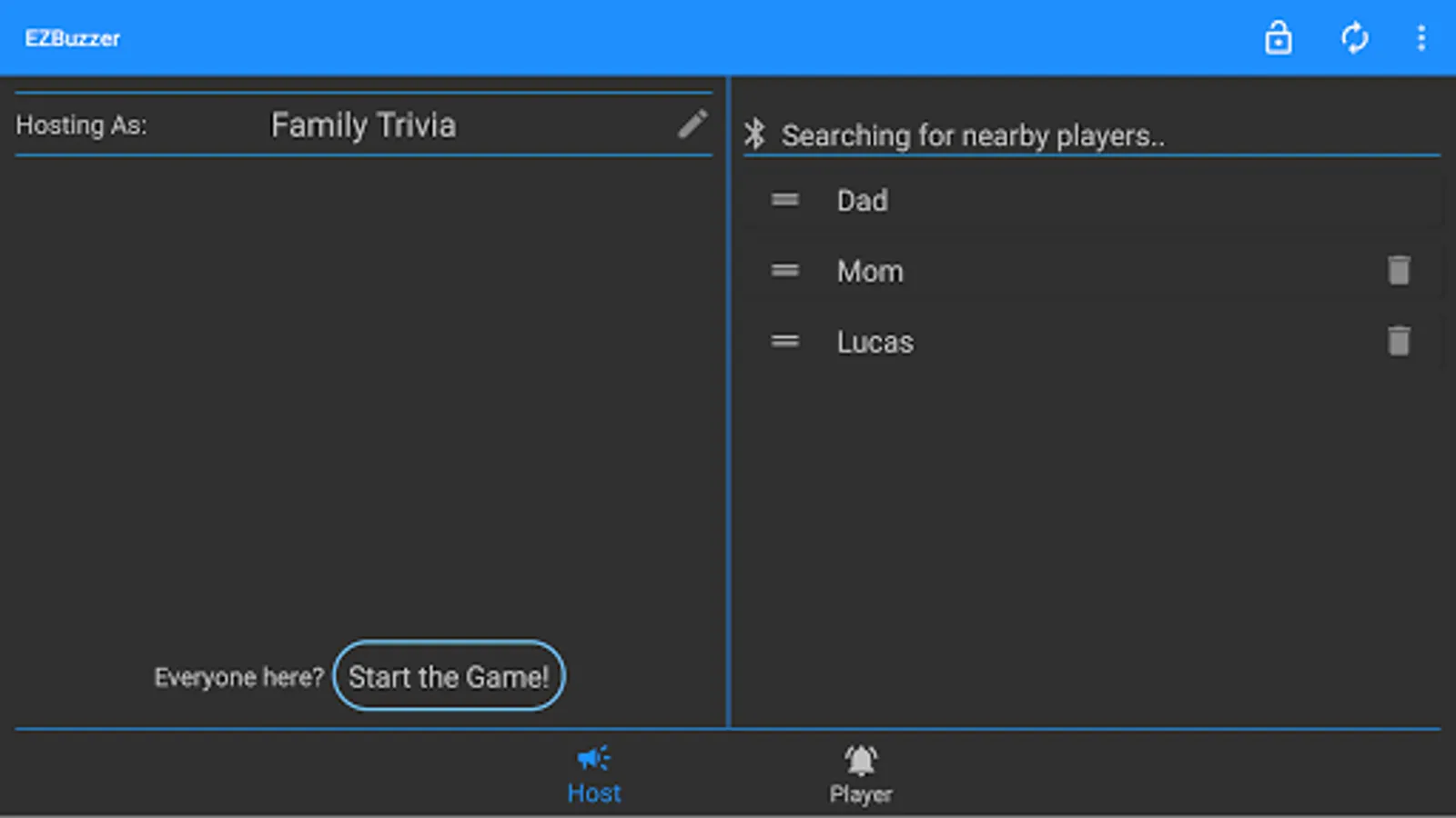 Looking for a Jeopardy Buzzer, Family Feud Buzzer, Quiz Bowl Buzzer, Trivia Buzzer, or playing any kind of game where a buzzer is needed to decide who rang in first? This app is a wireless, easy, and free solution, and no WiFi is required! One person plays as a Host, and then up to 15 other devices can join via Bluetooth as Players. This app does NOT contain any questions, but it DOES allow you to add a way to "Buzz In", award points, and/or keep time to any game which calls for it.