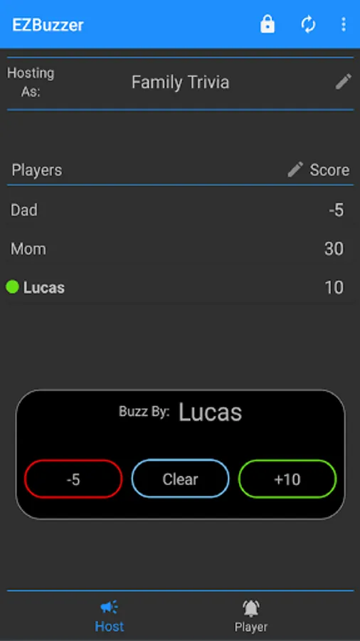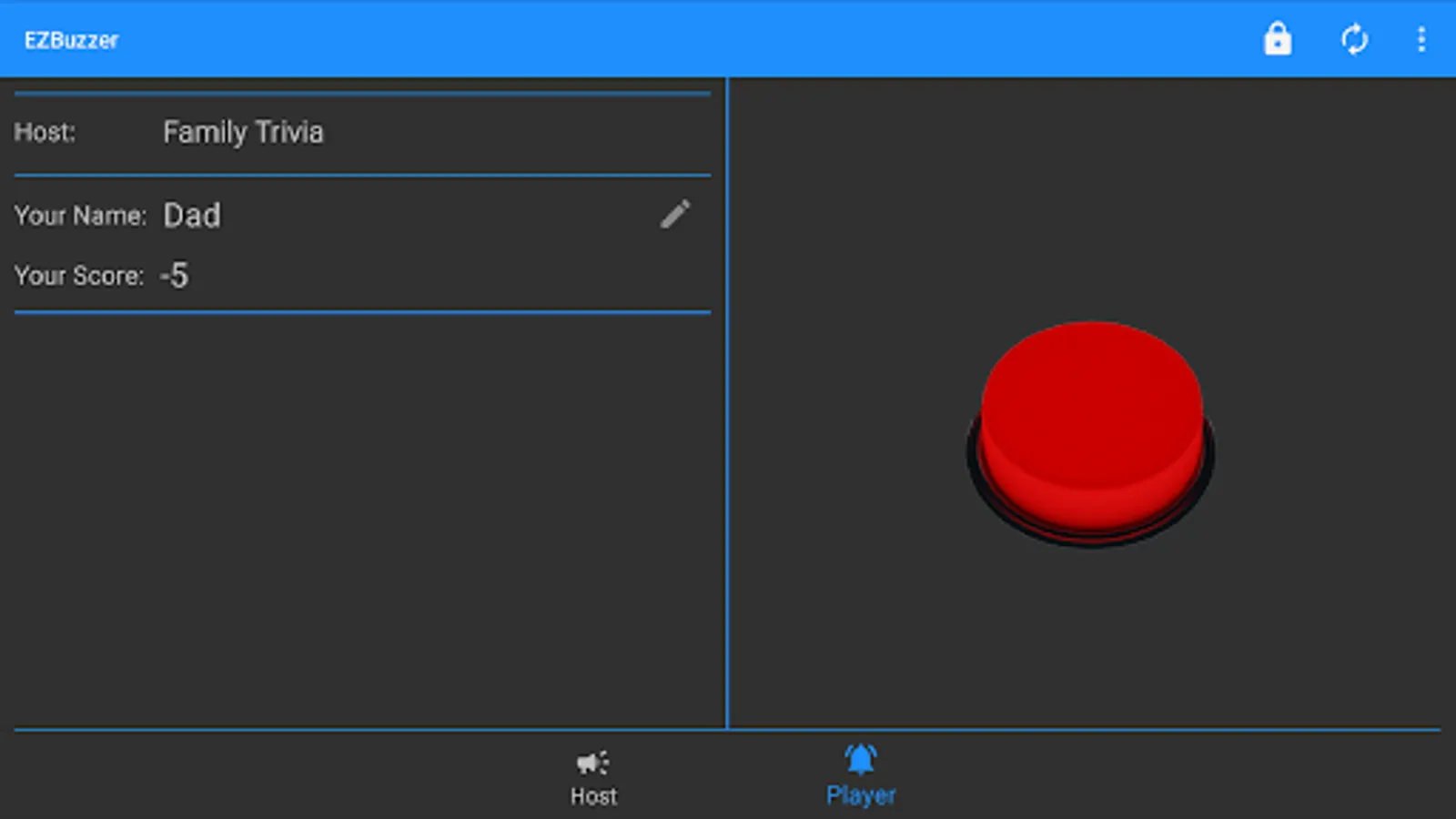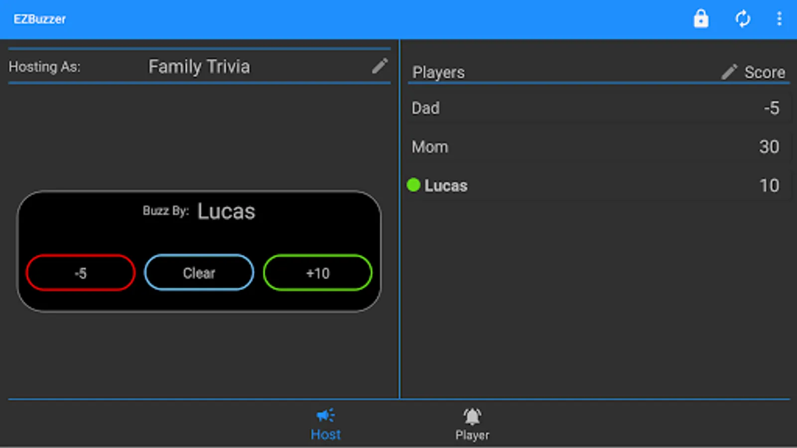 You can keep track of scores, and customize the value of right or wrong answers. You can group players into teams, and track scores by both player and by team. You can add optional Bonus Points if your game calls for it. You can even add a Game Timer to know when your game is done! Short on people? One person can serve as both the Player *and* the Host, awarding points while still being able to buzz in!