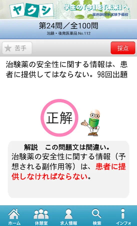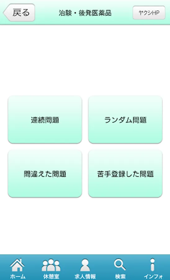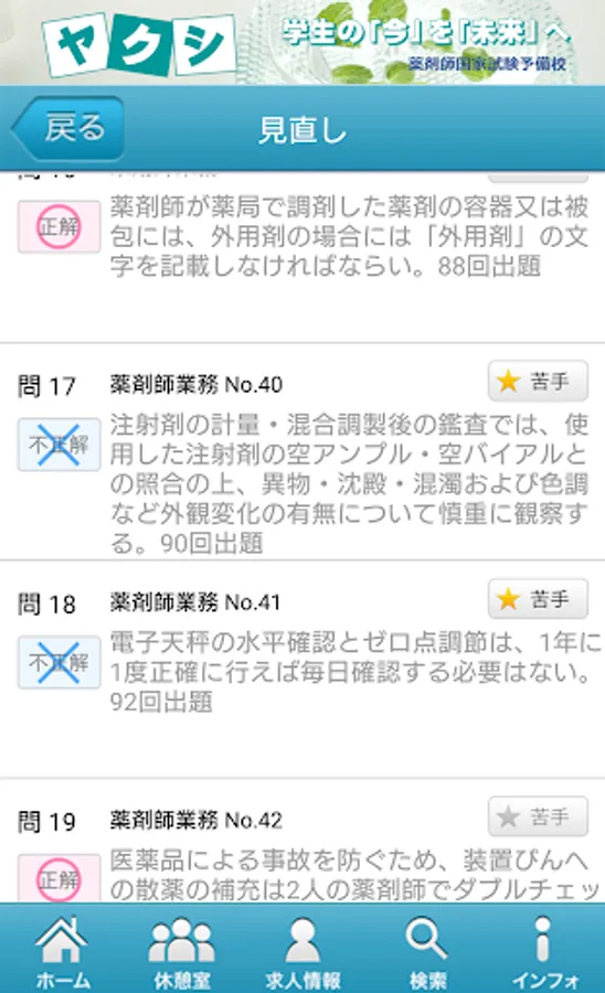 ・「検索」…好きなキーワードを入力して問題を検索できます。(101回、配合注意、投与量…など)
