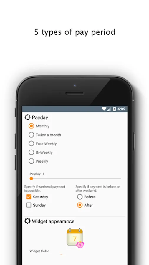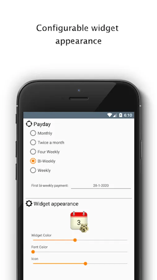 Help yourself with this new little widget for your home-screen. Set up an daily countdown to payday! Customize the widget and choose several colors and additional icons to combine them into your own designed day counter!