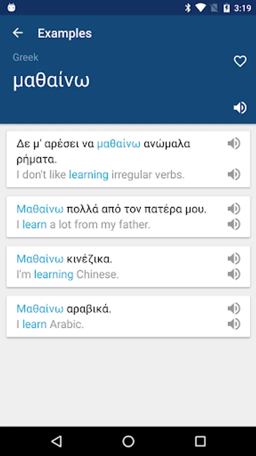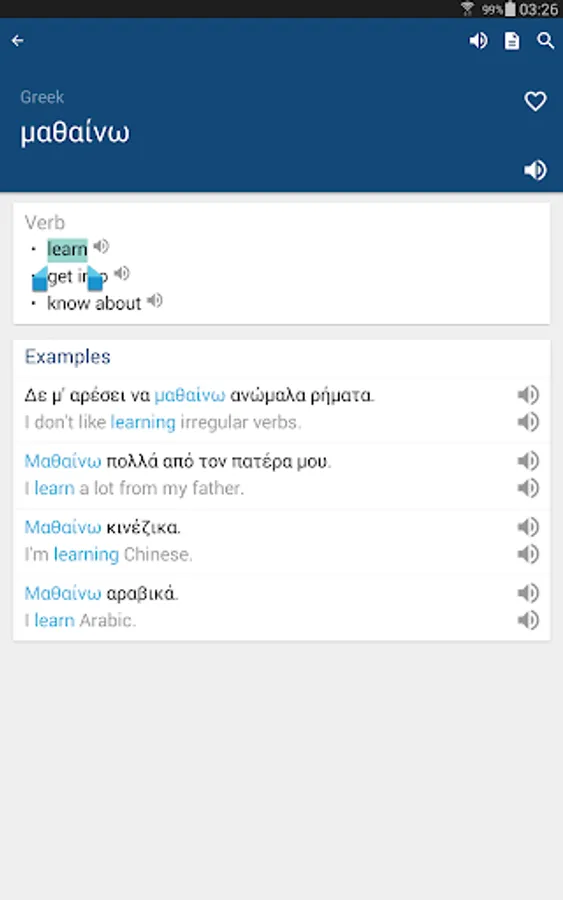 The Greek English Dictionary & Translator app enables you to search Greek & English words with definitions, examples, pronunciation, and more.
