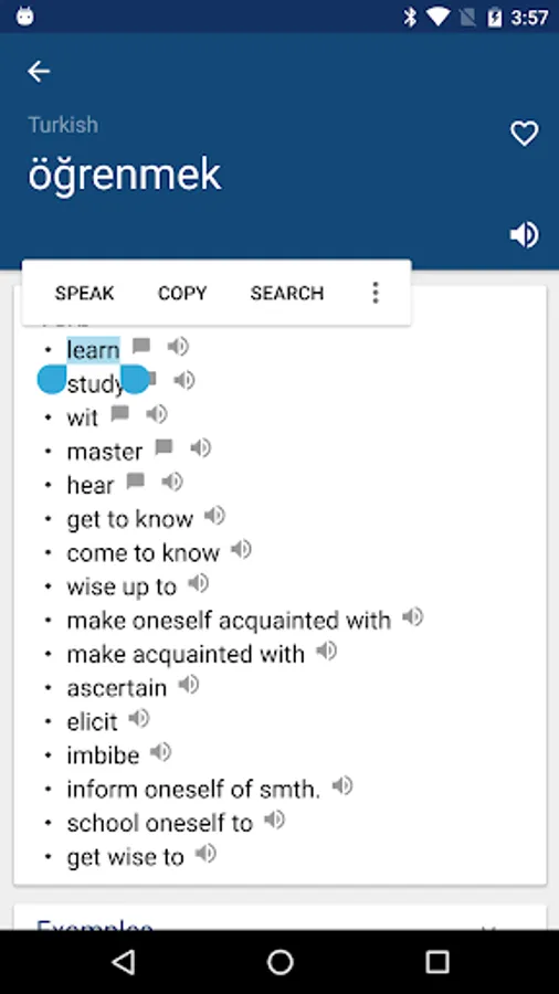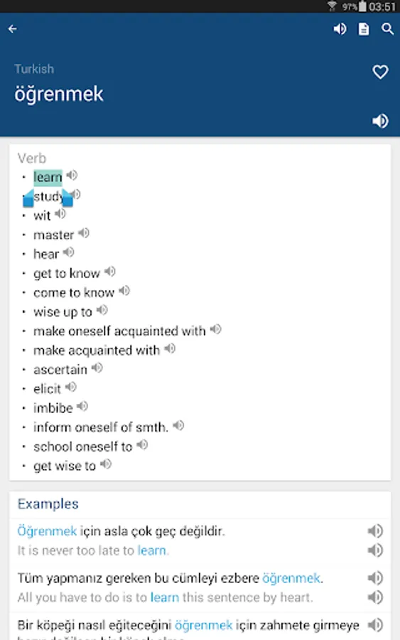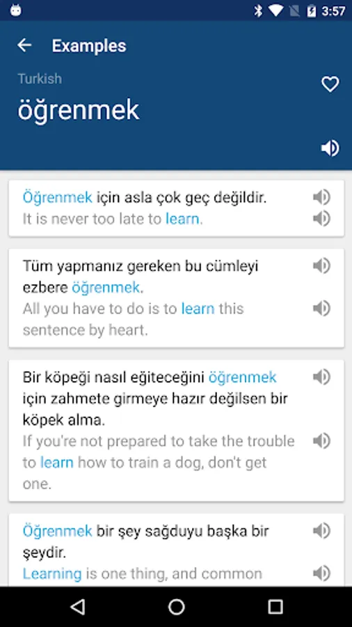 The Turkish English Dictionary & Translator app enables you to search both Turkish & English words with definitions, examples, pronunciation, and more.