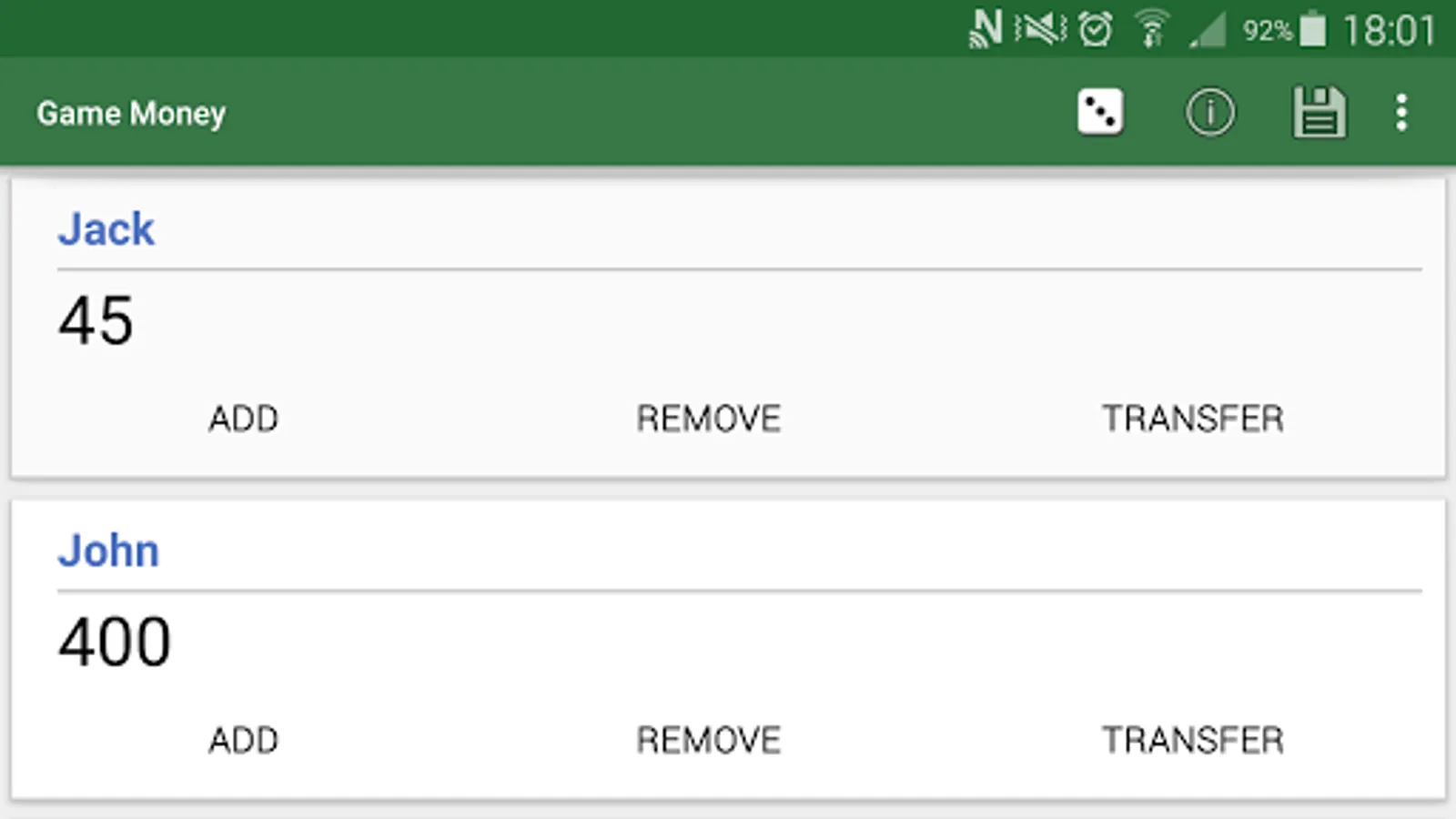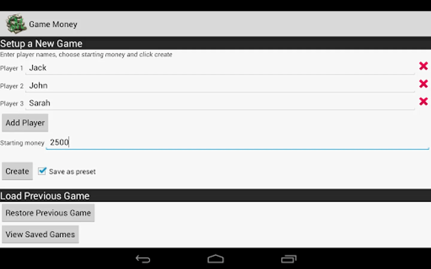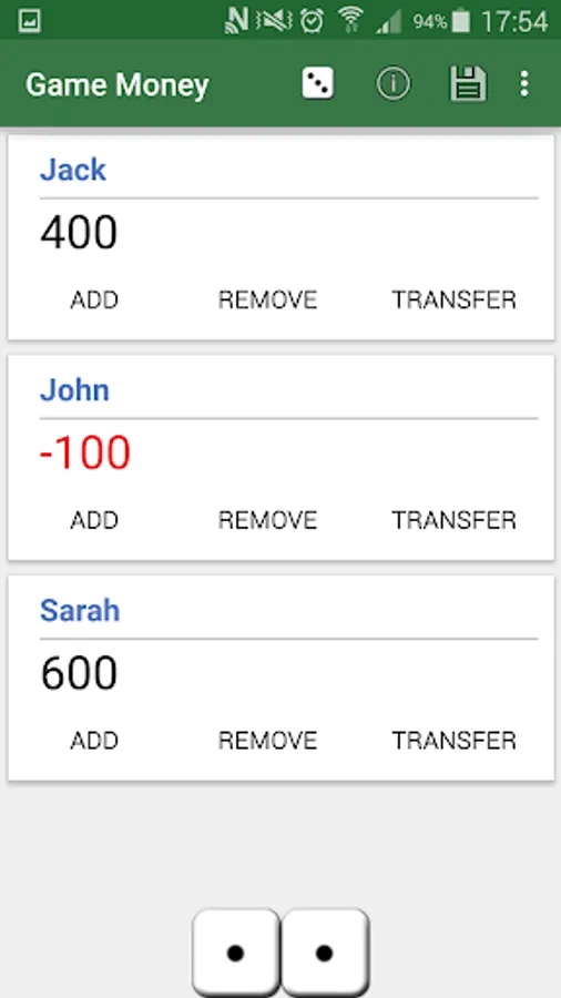 Game Money allows you to keep track of players money for games such as board games that use paper money, using your device to add, remove and transfer money between players rather than using paper money.