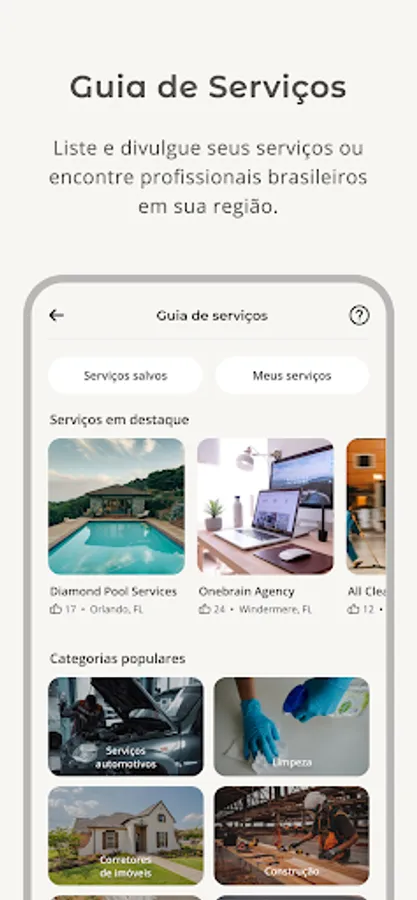 List and advertise your services or find Brazilian professionals in your region, all organized by the category of service you want and classified according to recommendations from other users.