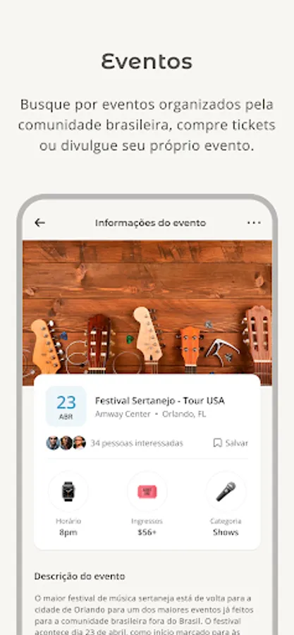 Search for community-organized events, concerts by Brazilian artists, buy tickets or advertise your own event to other users located in the same region as you.
