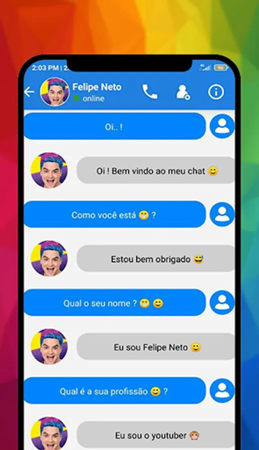 Today, felipe grandson is coming with many resources, as you can simulate a fake call with the famous person you like and his idol, so here in felipe grandson called fake, you also have a fake chat with him and also getting an interesting video call from felipe neto app, and there is also a contact section where you can also get in touch by calling other famous personalities, related to felipe neto and luccas toon.