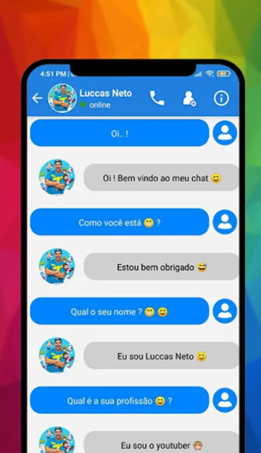 Today, luccas grandson is coming up with many features, as you can simulate a fake call with the famous person you like and his idol, so here in luccas grandson called fake, you also have a fake chat with him and also getting an interesting video call from luccas toon app, and there is also a contact section where you can also get in touch by calling other famous personalities, related to felipe neto and luccas toon.