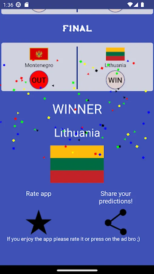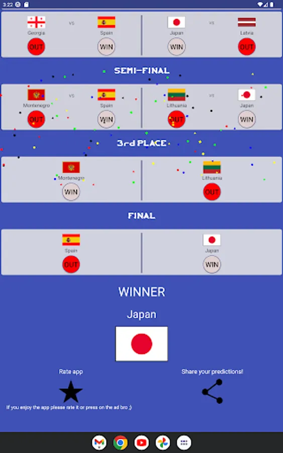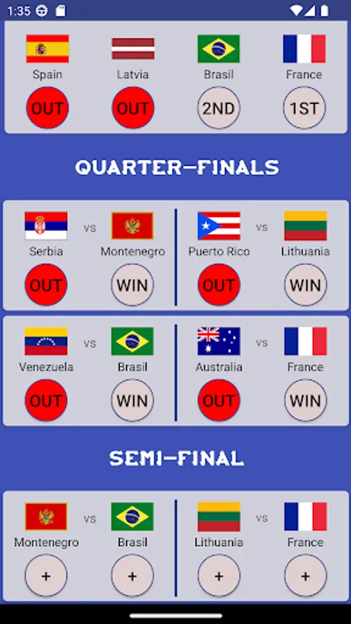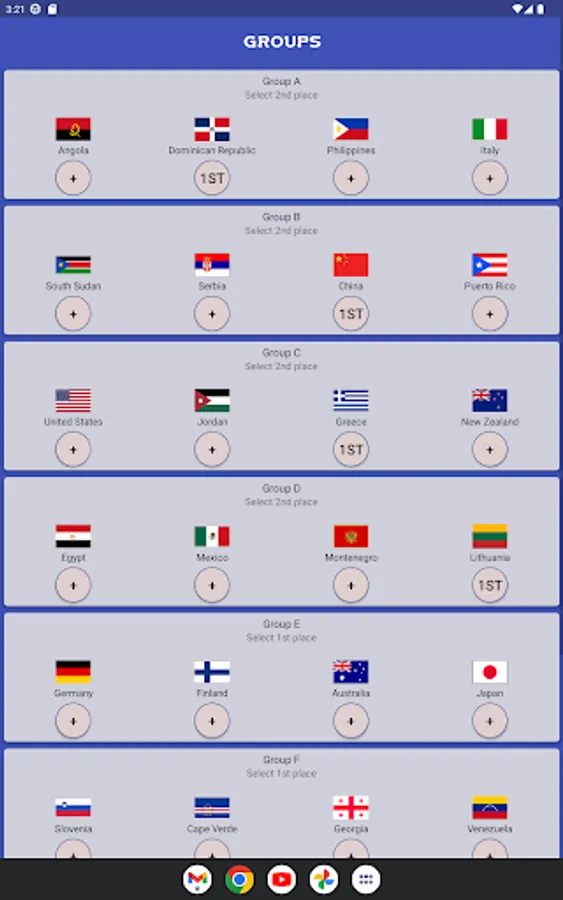 Select group A-H qualifiers, then I-L winners. After that you can choose quarter final, semi-final, 3rd place winners. Finally, pick the winner of Basketball World Cup 2023 and share all your predictions to your friends and compare with each other! Later in the end of the championship, you can compare how accurate you were. Hope you enjoy the app, have fun!