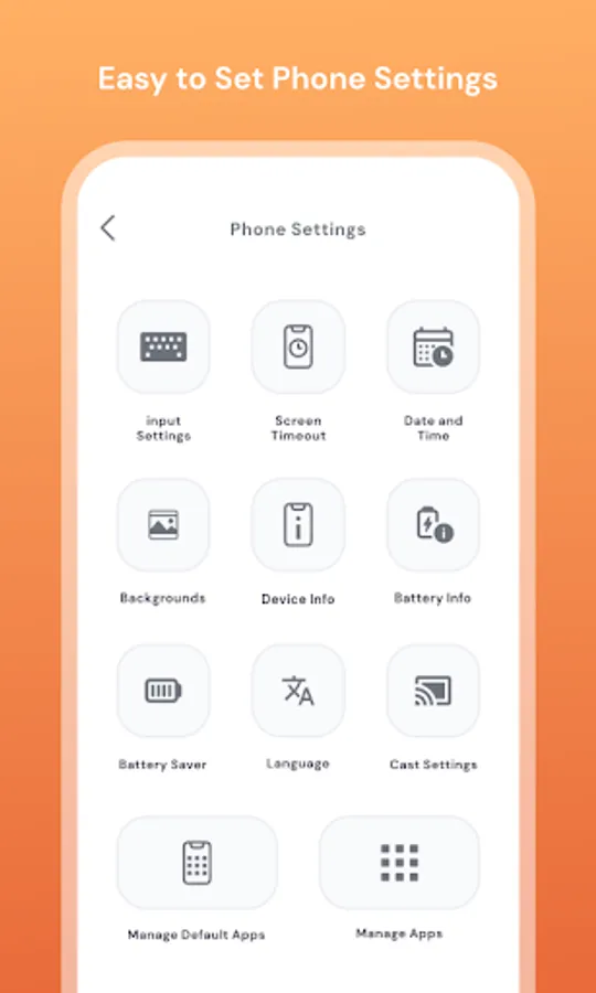In phone settings you can manage screen timeout, date & time. background, device & battery Info, screen cast and many more..