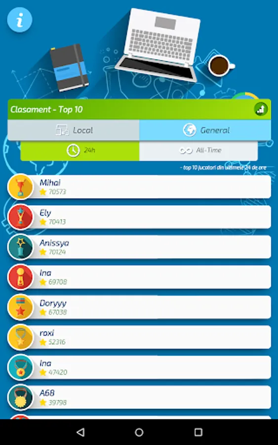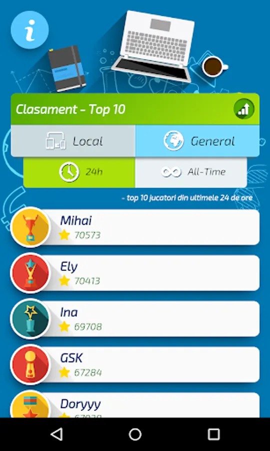 - clasament cu top scoruri - clasament local, clasament pe ultimele 24 ore si clasament al tuturor timpurilor
