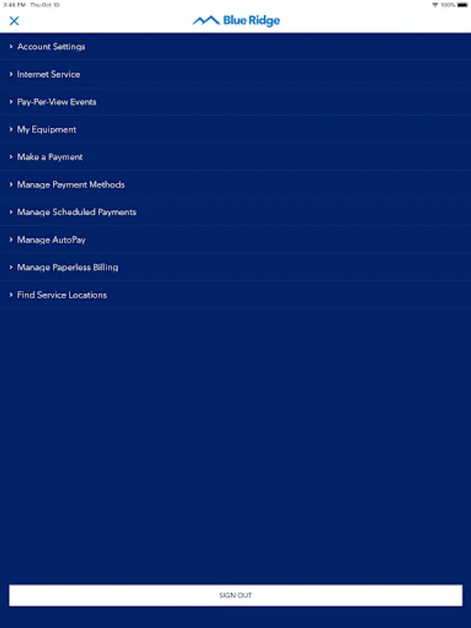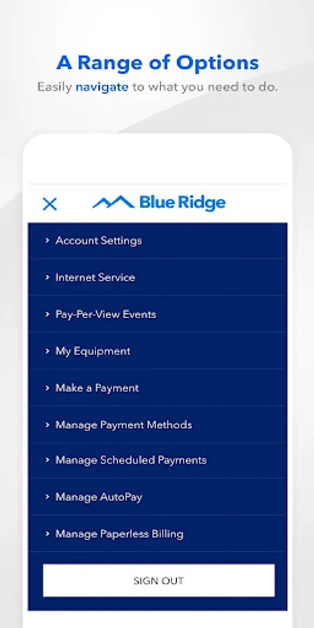 Easily manage many aspects of your Blue Ridge Communications account with the My Blue Ridge App. Whether you need to quickly make a payment, upgrade your internet speed, or order the next big thing on pay-per-view, you can do it right from your phone.