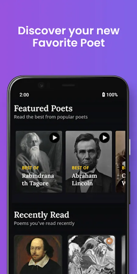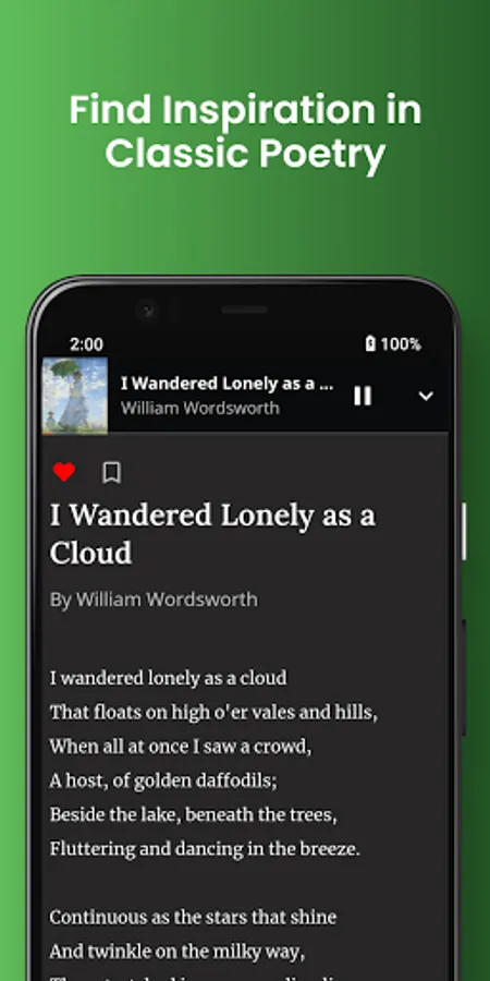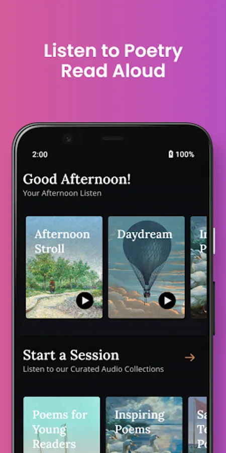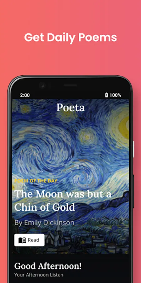 Get your daily dose of poetry! Everyday, Poeta features a new handpicked poem sent straight to your phone. Listen to poetry in our curated collections, recorded exclusively for Poeta!