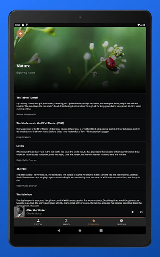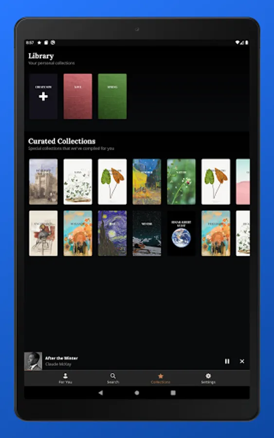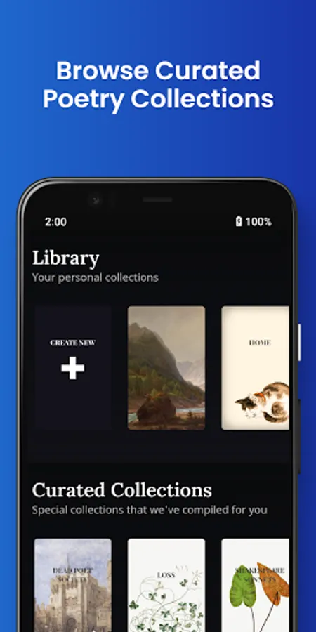 You can also create your own curated collections. You can personalize these collections by selecting from a large assortment of illustrated covers, allowing your collections to feel like personal poetry books.