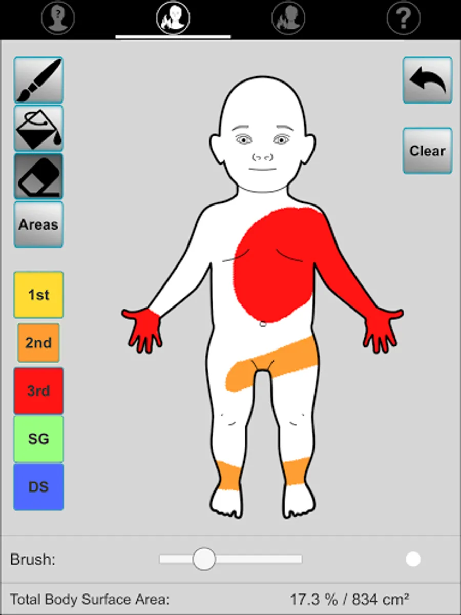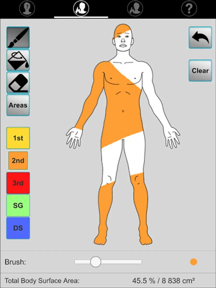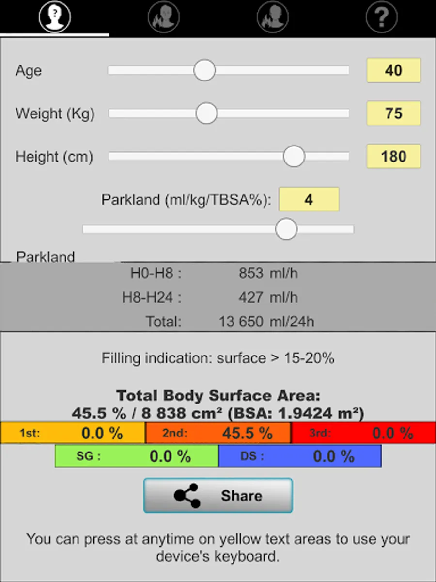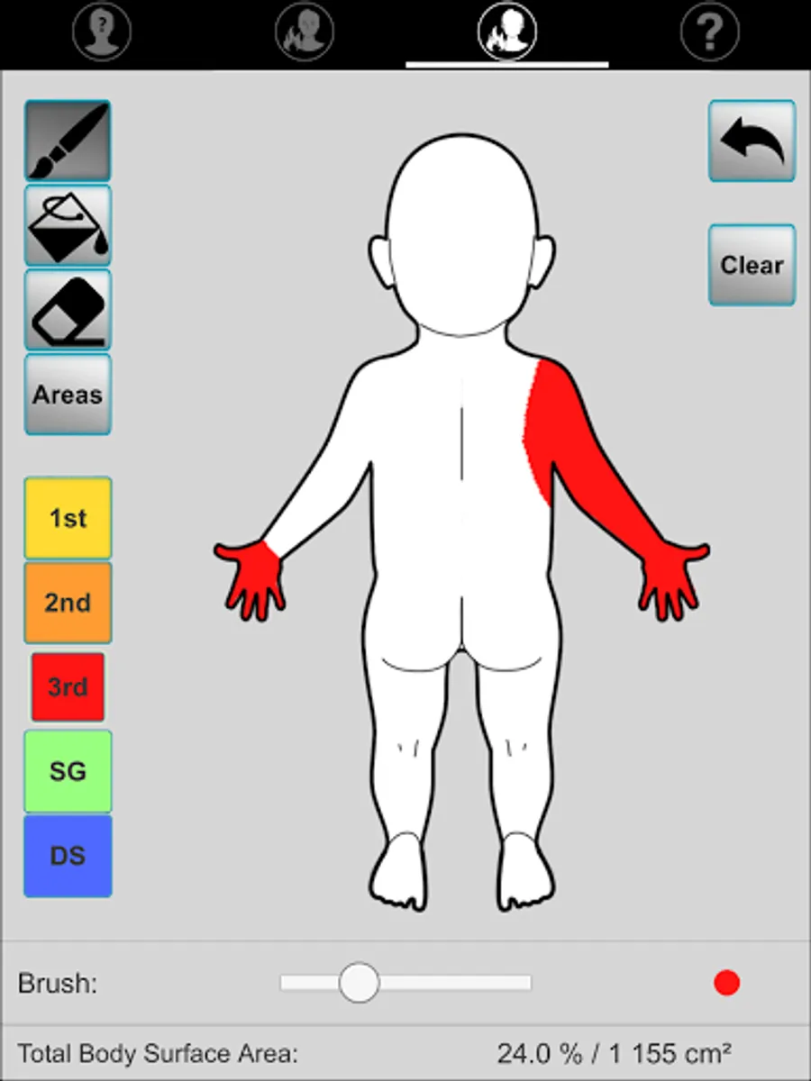 Application aimed at guiding initial fluid management (adults and children) after drawing the burned surface on a template (Lund and Browder chart).