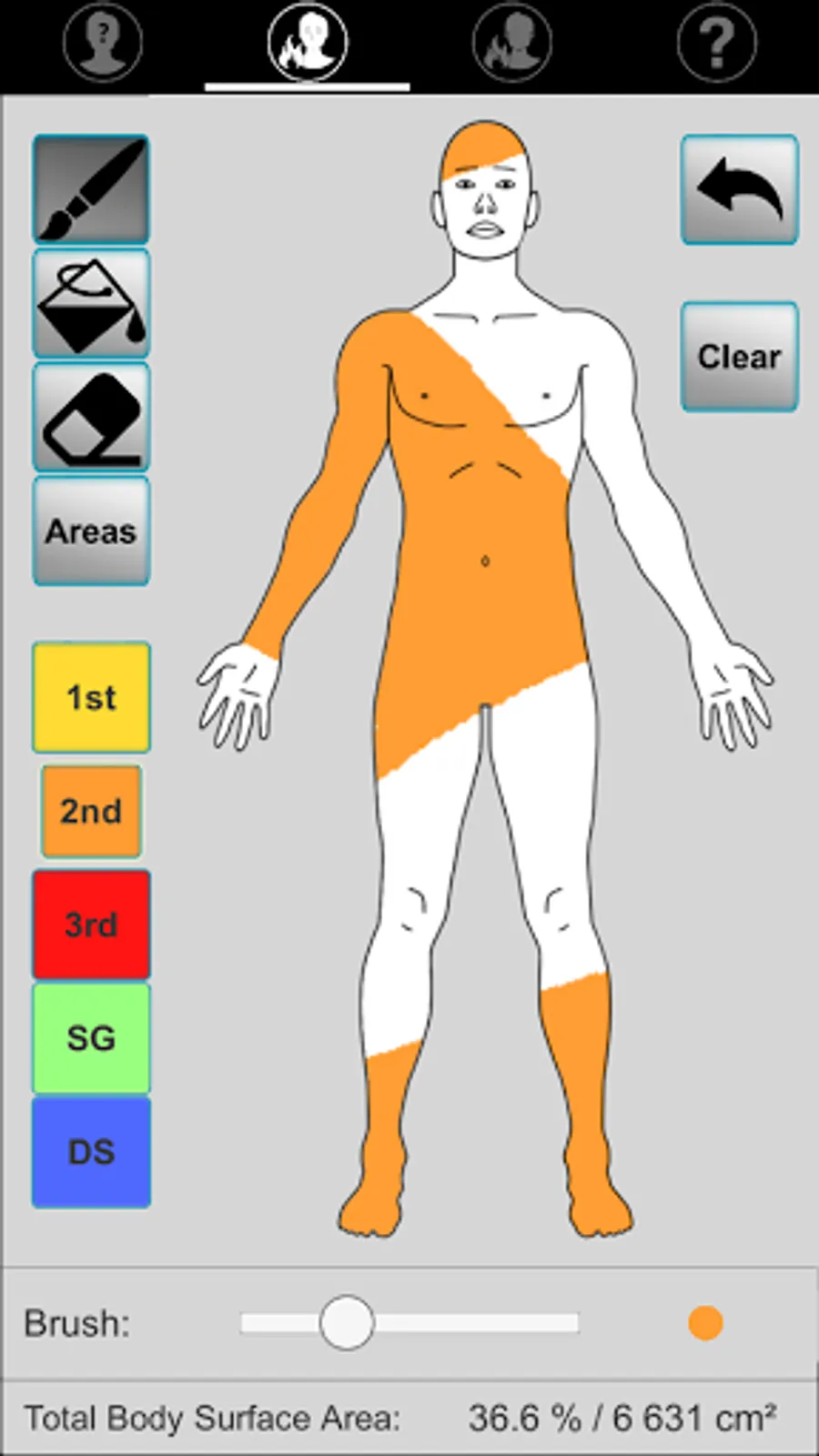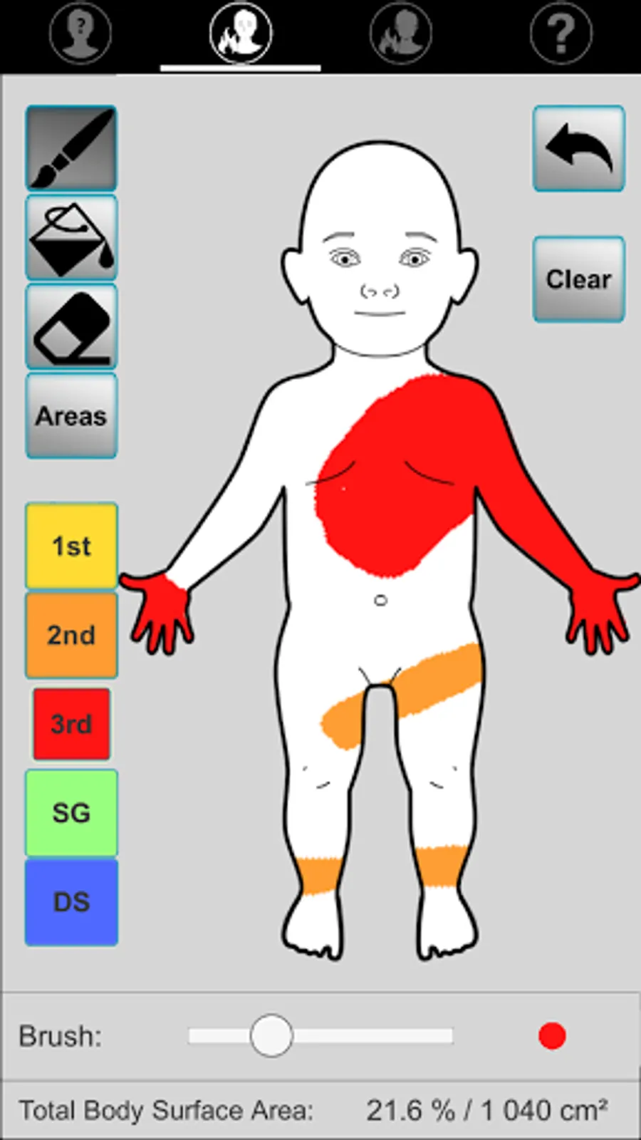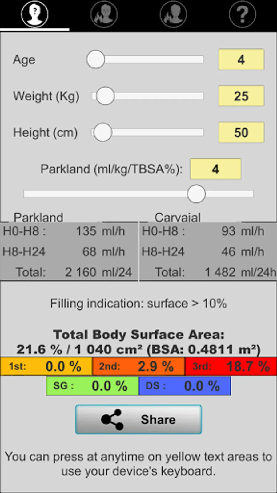 Application aimed at guiding initial fluid management (adults and children) after drawing the burned surface on a template (Lund and Browder chart).