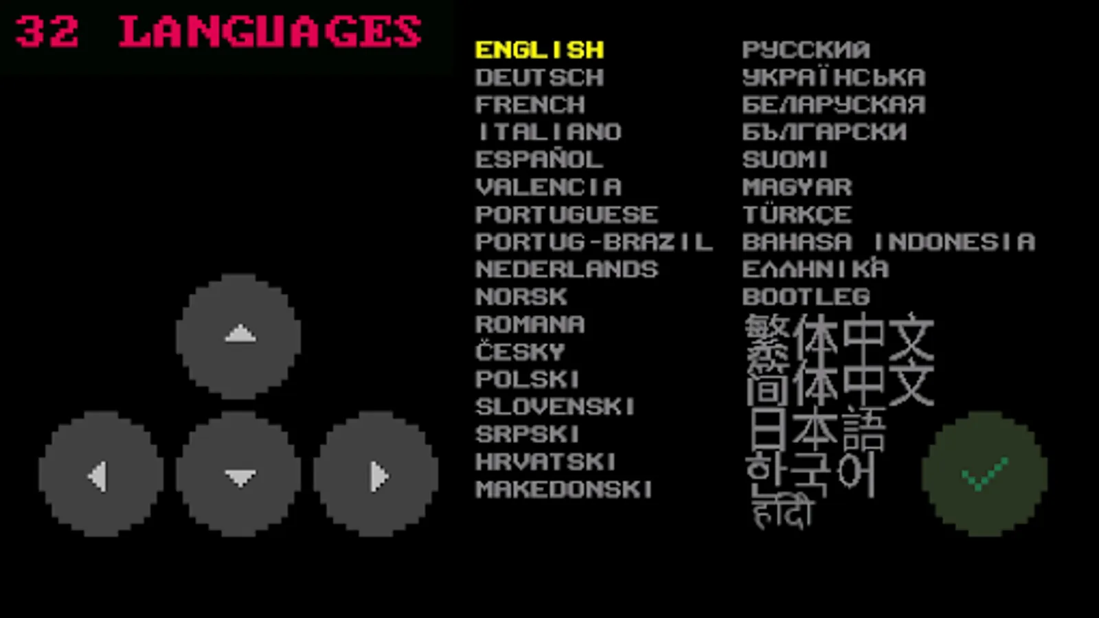* PAL/NTSC modes: If the game feels too unforgiving, you can tone down the difficulty, lowering the framerate to 50 (PAL). Note, though, that music and sounds become more evil at the 83% of their original pitch.