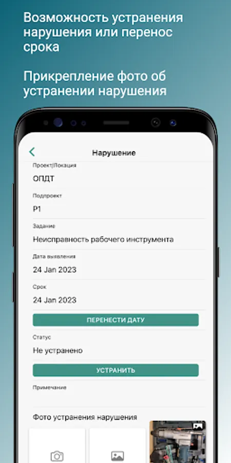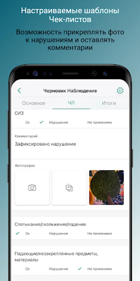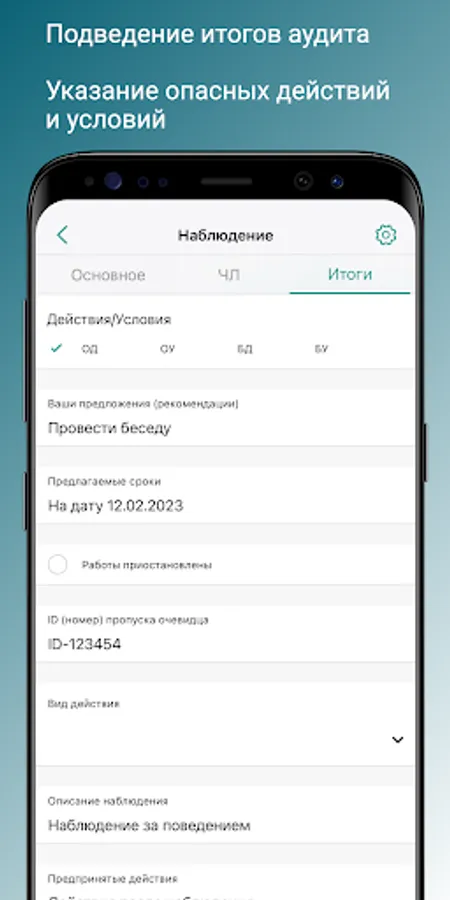 The application allows you to conduct an audit in the field and upload it to the BRealIT software for further generation of violations and measures, as well as to eliminate violations in which an authorized user is assigned responsibility.