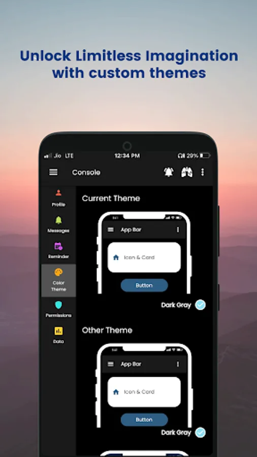 * Customized features include push notifications and scheduled reminders. Theme settings offer both dark and light themes for day and night usability.