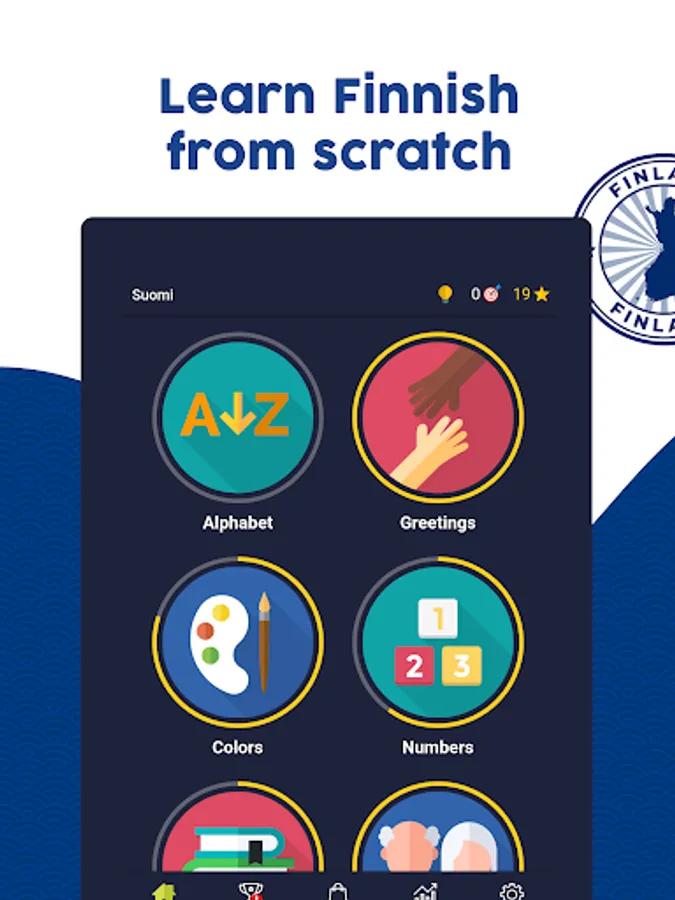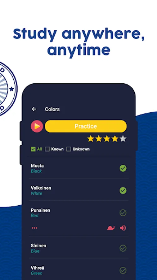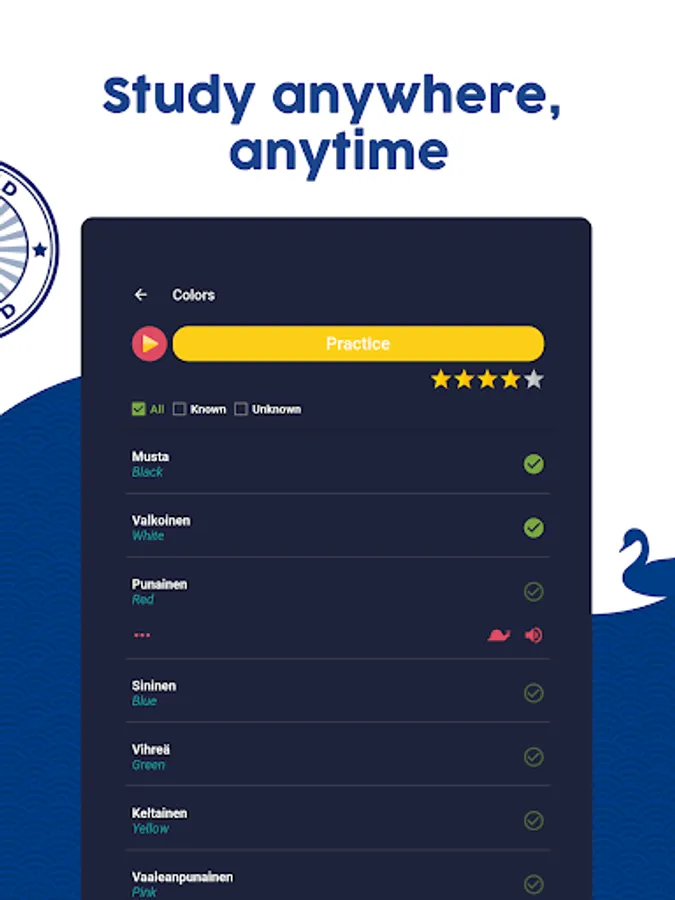 In addition to studying a large and diverse selection of Finnish words, you'll also be able to practice your listening, reading and writing skills in the way you find most interesting! In each test, you will be able to select which activities you want to perform, according to your knowledge of the category.