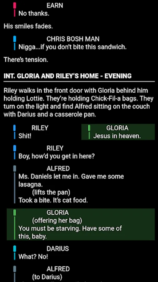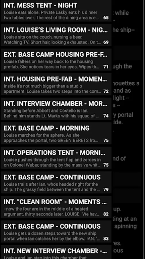 - Scene navigation: swipe from the left edge of the screen to see a list of all the scenes in the script. Tap one to navigate directly to that scene.