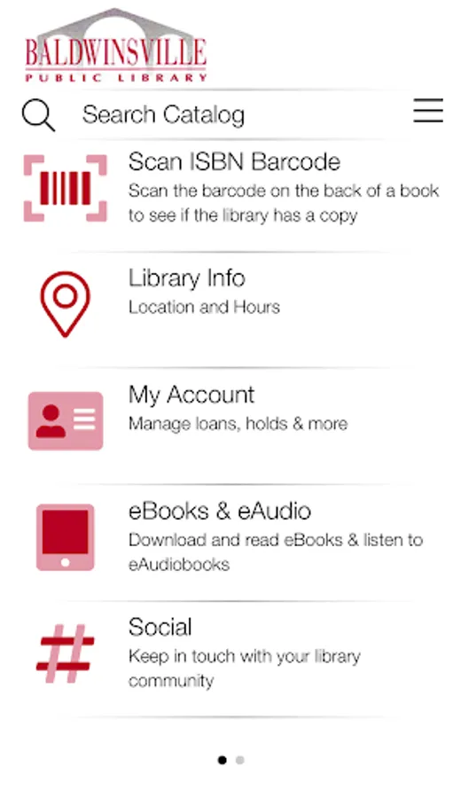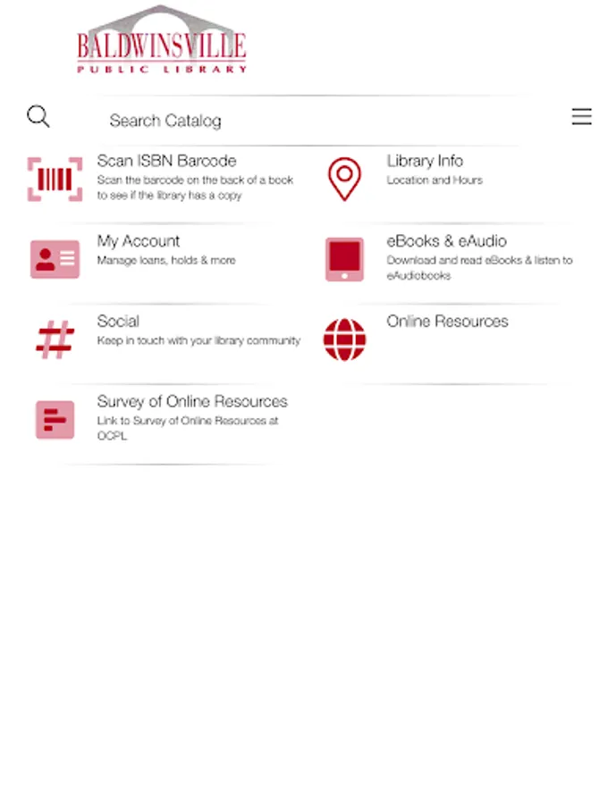 Welcome to the Baldwinsville Public Library's mobile app. Manage your account, search the catalogue, renew and reserve books from any device. You can check out e-books, audio books, movies, music, tv shows virtually as well as search the catalog for books, DVDs and music; use My Account to renew materials and place holds; ask a librarian for help, check out the calendar of events, register for programs and follow us on Facebook and Twitter.