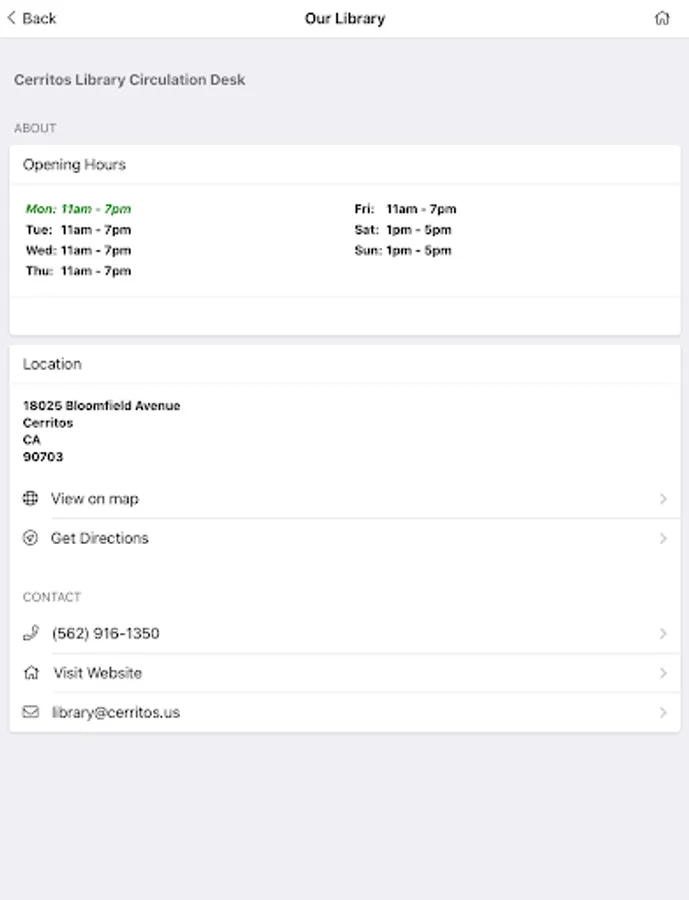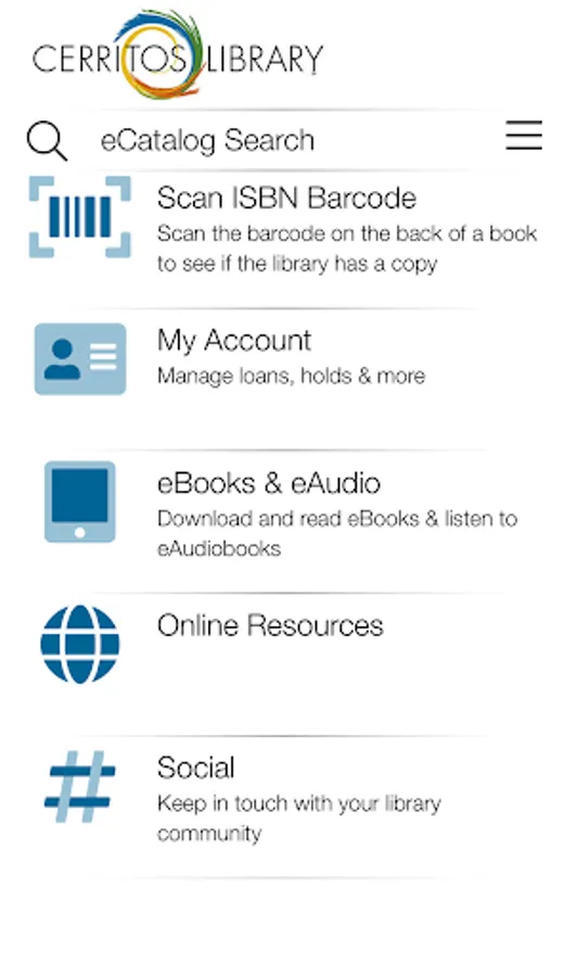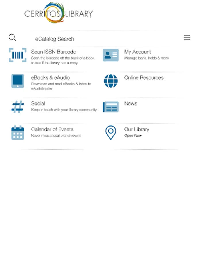 Experience the Cerritos Library from anywhere in the world through the Cerritos Library To Go mobile app. Take a tour of the award-winning library, browse the eCatalog, check the event calendar, connect to the library’s YouTube videos or contact a reference librarian. Scan a book’s ISBN barcode to find out if the book is in the library’s collection. Cerritos Library cardholders can access their accounts and the library’s research databases, download eBooks and eAudio Books and place books on hold.