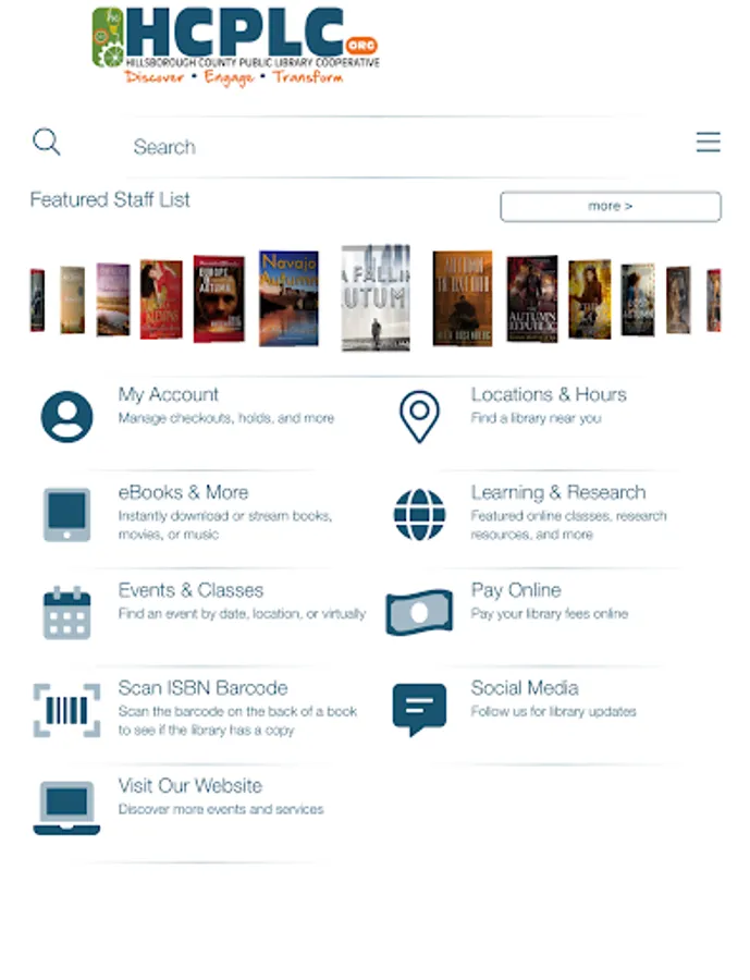 With the HCPLC app, you can find and discover titles, place holds, and manage your account. Plus, you can find your nearest library location, view upcoming programs at your local branch, and access featured digital resources.