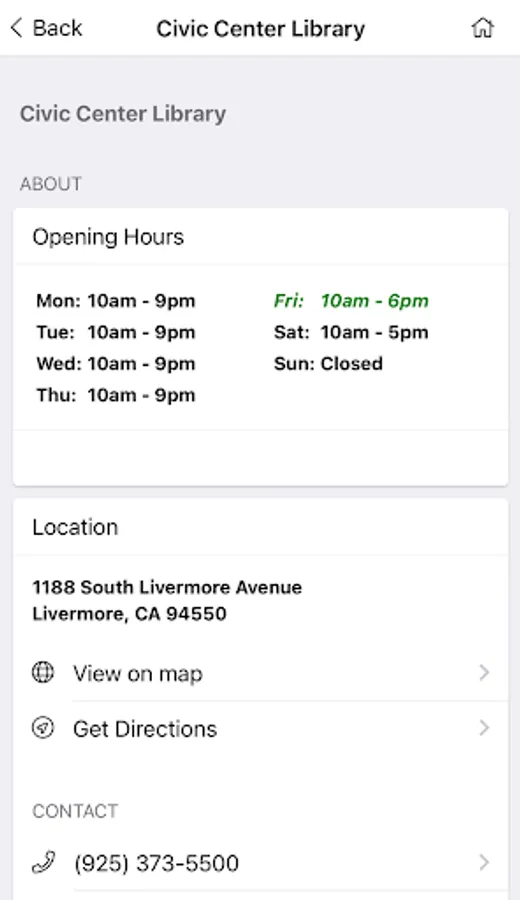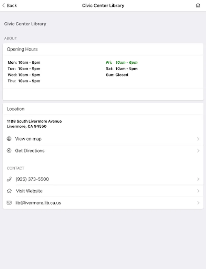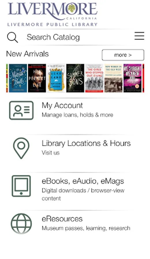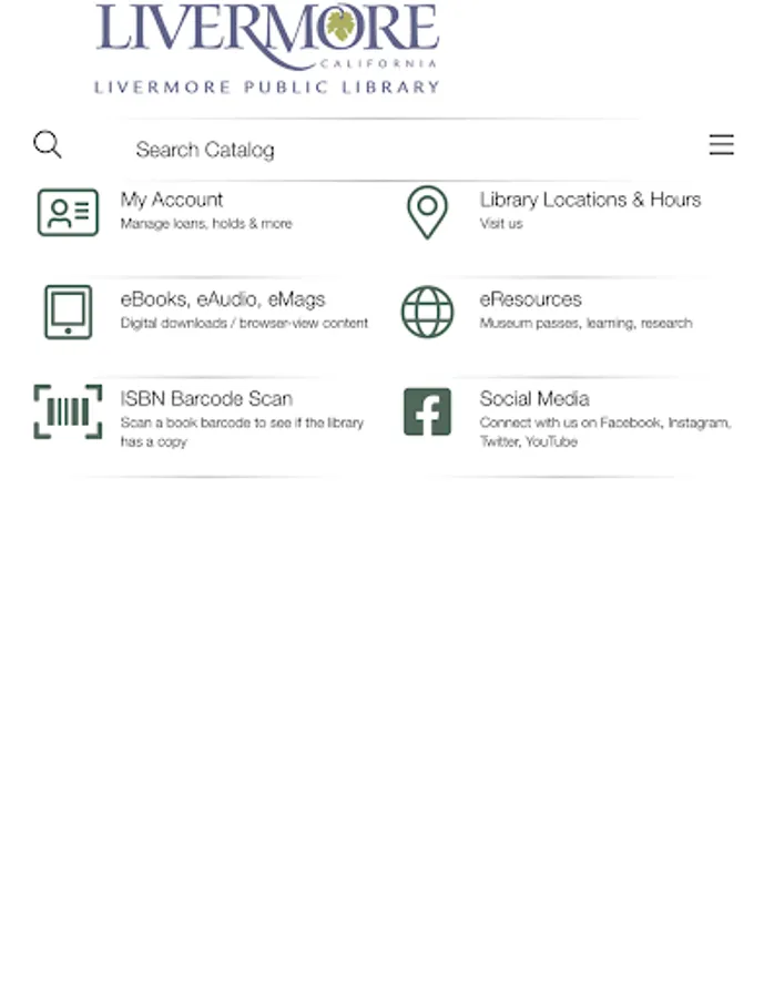 Access Livermore Public Library from your Android phone or tablet. Search for books, DVDs, audiobooks, CDs, and more. Place holds, check due dates and renew items. Find out what’s happening at the library, or contact us.