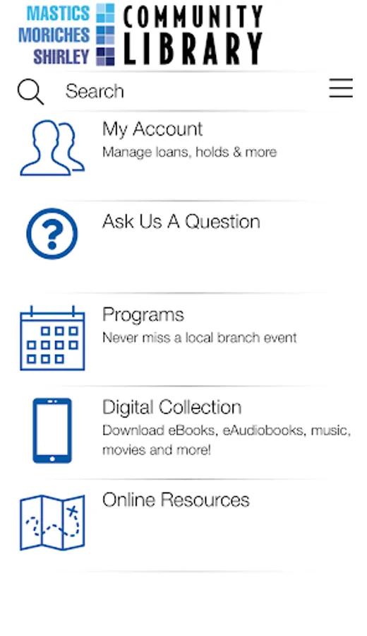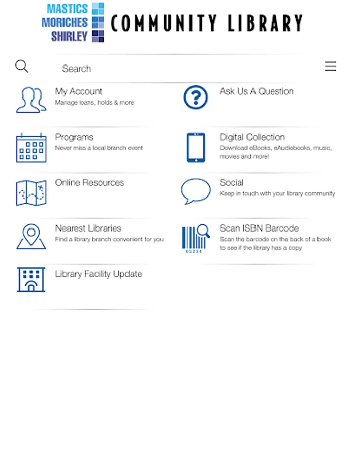 MMSCL, the mobile app for Mastics Moriches Shirley Community Library, lets you locate and search your library catalog wherever you are. If you are a library card holder in and of the Mastics Moriches Shirley Community Library below, you can locate books, movies, music and more with easy search features designed for Mobile devices.